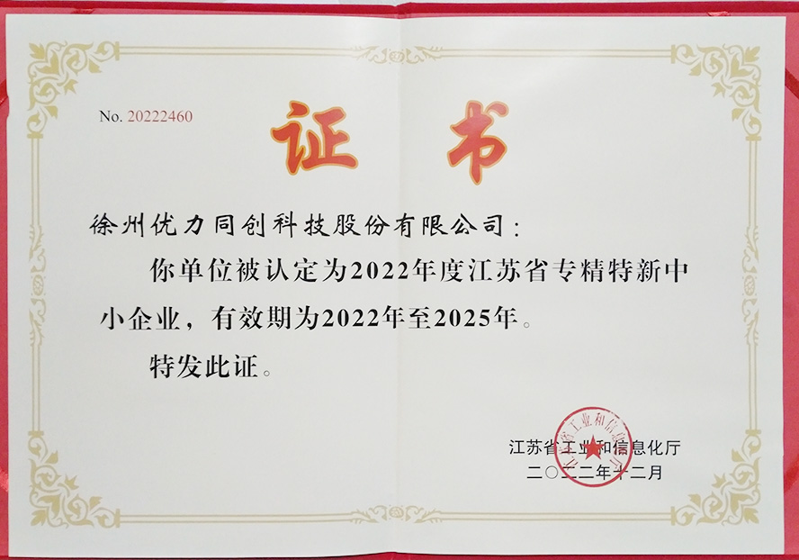 公司与2022年12月12日通过了江苏省工业和信息化厅认定的2022年度江苏省专精特新中小企业认定。