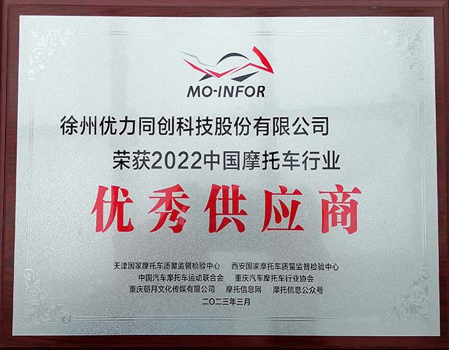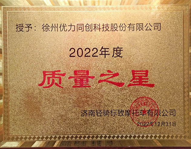 2022年12月31日,获济南轻机标志摩托车有限公司颁发质量之星荣誉证书,是对我公司一年以来的工作肯定,公司将继续做好产品、好质量、好服务,持续为客户提供高价值产品与服务。 徐州优力同创…